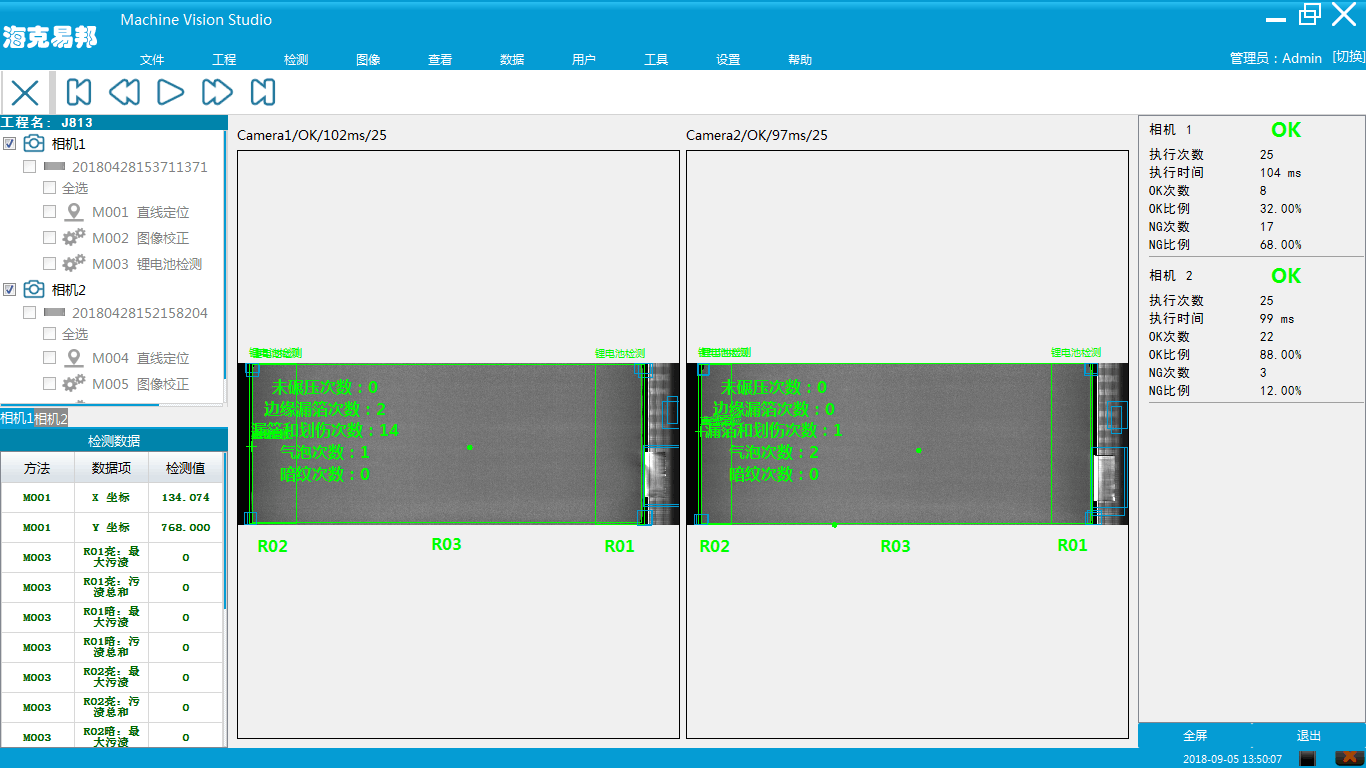 極片項目檢測:極片邊緣缺損面積檢測、極片折皺不良、接帶檢測、極片漏金屬檢測、貼膠露頭長度、貼膠垂直度檢測、膠紙是否蓋住極片、對位貼膠紙錯位檢測、有無保護膠紙檢測