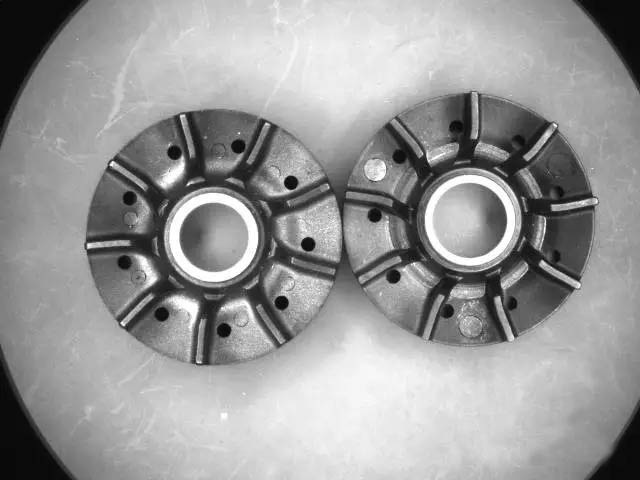 客戶為多家水泵制造商生產(chǎn)葉輪,其現(xiàn)場同時生產(chǎn)的有幾十個型號,在工藝環(huán)節(jié)中涉及多個型號共用設(shè)備的情況。多個型號的葉輪的外觀、尺寸非常接近,極易混雜,如圖1所示的就是兩種不同型號的葉輪,外觀非常接近。
