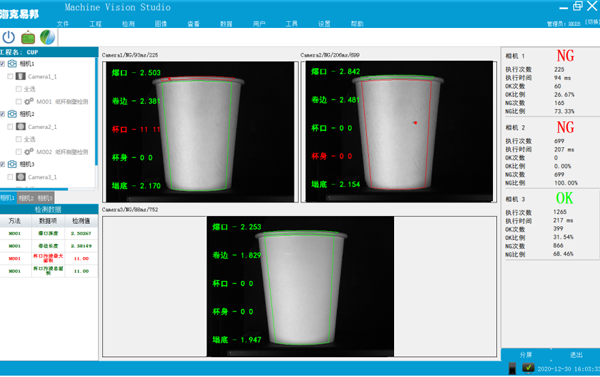 1.主要功能:紙杯口部、紙杯底部缺陷檢測、污漬檢測,檢測結果IO信號輸出。   2.主要功能:紙杯外側壁缺陷檢測、污漬檢測,檢測結果IO信號輸出。