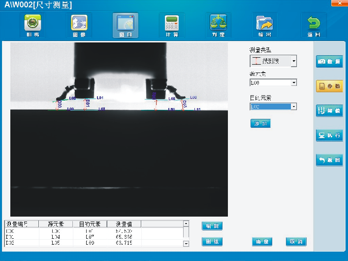 如圖所示,視覺系統(tǒng)自動對檢測位置進行提取并測量最高點與基準面的距離,在閾值范圍內(nèi)判定位合格品,超出閾值范圍則判定為不良品并輸出不合格信號。