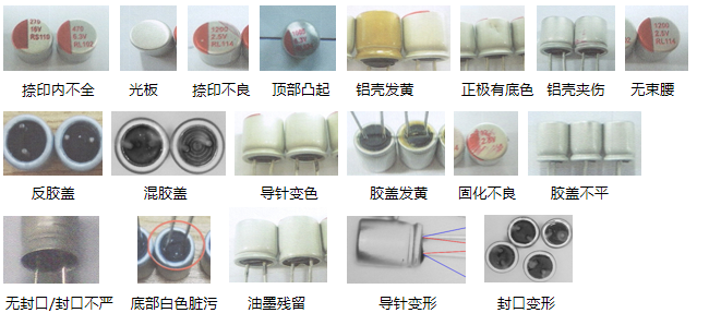 直插式電容頂部字符缺陷、頂部正負極方向缺陷及正負極印刷質量檢測。