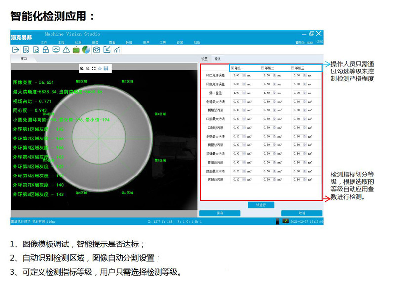 1.產(chǎn)品自動定位:檢測時實時定位商標特定圖案,給出當前位置的初始位置的偏差,檢測區(qū)域位置自動補償,實現(xiàn)產(chǎn)品自動定位功能。